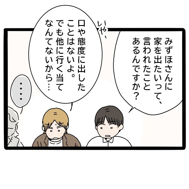 「みずほさんに家を出たいって言われたことあるんですか?」と聞く隆明さんに「いや、口や態度に出したことはないよ。でも他に行く当てなんてないから」と憲一さん。じっと黙って聞いていたよっちゃんは