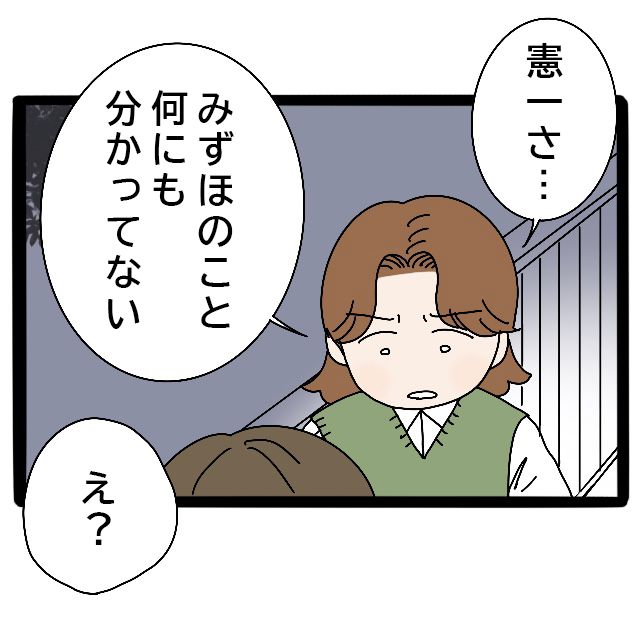 よっちゃんは更に憲一さんに伝えました。「みずほは、結婚する時、親を亡くして行き場のなくなった自分を哀れんで結婚してもらったんじゃないかって」