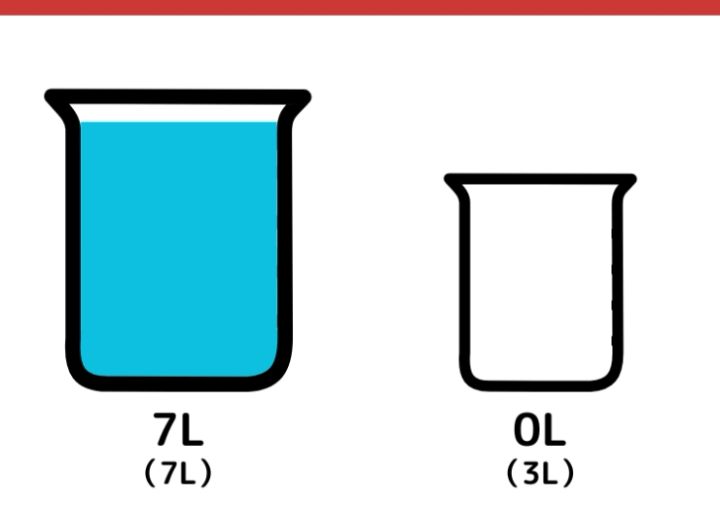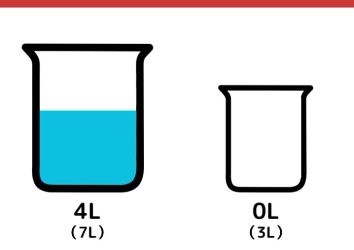 この時点でそれぞれの容器は、次の通りになります。7Lの容器→4L、3Lの容器→3L。