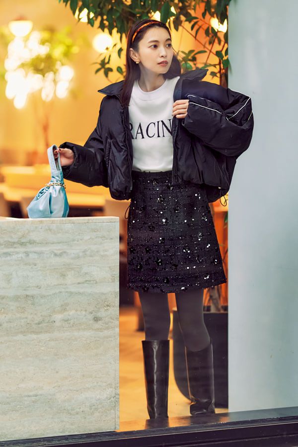 きらめくスカートでモノトーンに抜け感をON。メンズライクなダウンにカジュアルなボトムを合わせてしまうと適当コーデに見えがち…。スパンコールやドロップパールなど、着映えアイテムでしっかり盛るのがおしゃれに着こなすポイントです♪