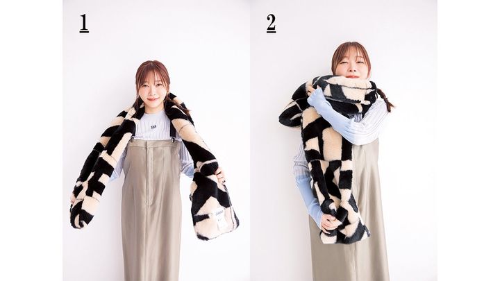「どんなに急いでいても、端っこをさらっと肩にかけるだけでサマになる超王道のマフラースタイル。厚みのあるファー素材をチョイスすれば、こんなにこなれ感が出ちゃうんですね。またもや勉強になりました。この冬は柄物に挑戦したいと思っていたので、デザインにもそそられちゃいます」