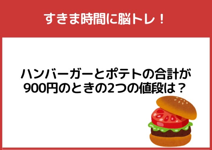 3. すきま時間に脳トレ!「ハンバーガーとポテトの合計が900円のときの2つの値段」は?