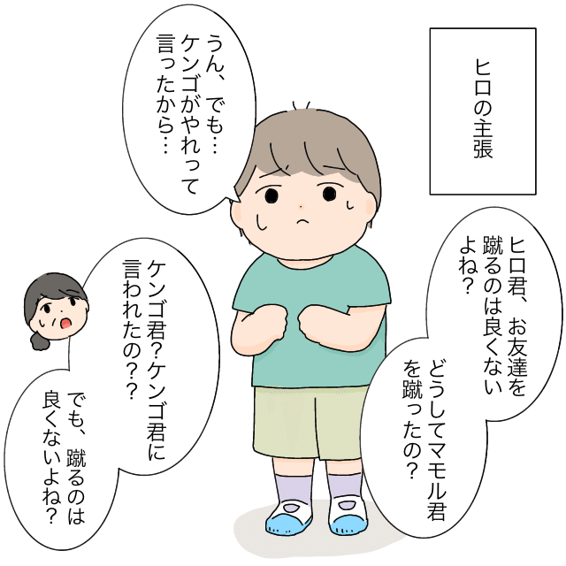 お次はヒロ君。「ヒロ君、お友達を蹴るのは良くないよね?どうしてマモル君を蹴ったの?」先生が言うと「うん、でも・・ケンゴがやれって言ったから・・(汗)」困りながら答えるヒロ君に、「ケンゴ君?ケンゴ君に言われたの??でも、蹴るのは良くないよね?」と先生が言いました。