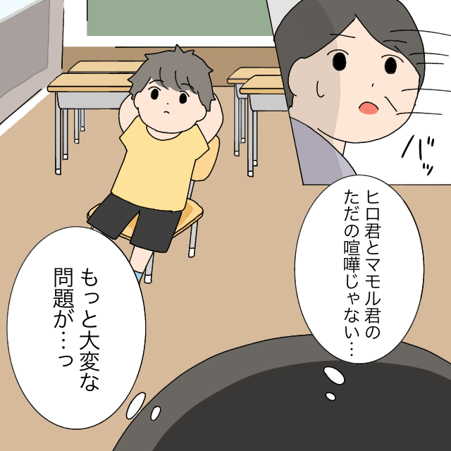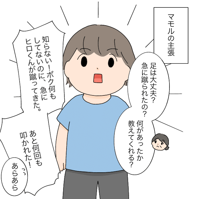 担任の吉村先生と一人ずつ話をすることになった子ども達。まずはマモル君。「足は大丈夫?急に蹴られたの?何があったか教えてくれる?」先生がたずねると「知らない!ボク何もしてないのに、急にヒロ君が蹴ってきた。あと何回も叩かれた!」と言うマモル君に「あらあら」と慌てる先生。