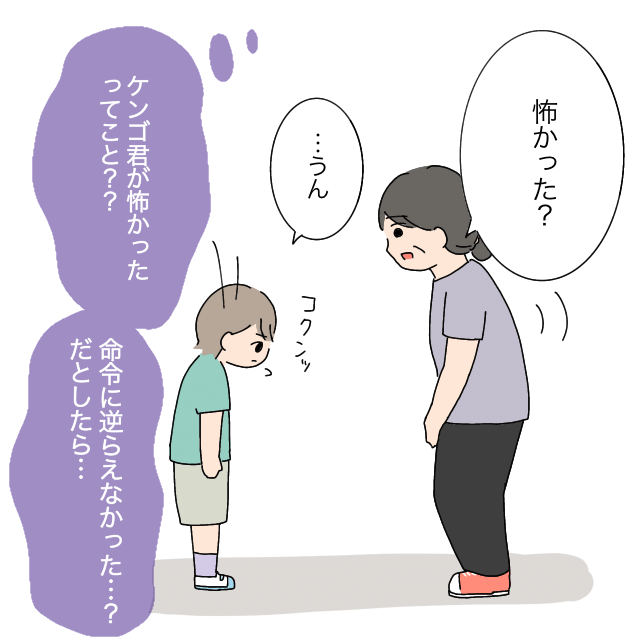 「怖かった?」先生がたずねると「・・うん」と頷いたヒロ君。先生は、「ケンゴ君が怖かったってこと??命令に逆らえなかった・・だとしたら・・」と思いました。