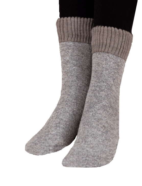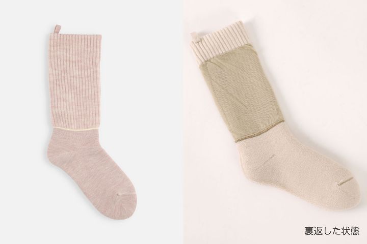 裏パイルに、さらに起毛をかけることで保温力を高め、ソックス内の体温の熱をキープ。はき口は、長時間はいても快適なリブ加工。色は写真のグレーのほか、フェミニンなラベンダーもラインナップ。