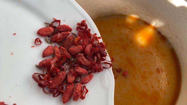 そしてこのスパイスがキモ! 唐辛子やクコの実が色鮮やかできれい! クミンもブレンドされています。