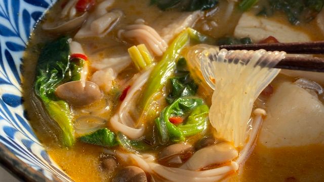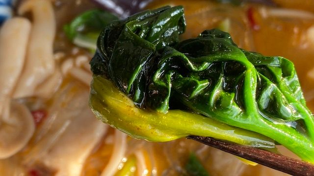 春雨にも具材にもスープがよく絡みます。ちぢみほうれん草は、肉厚で甘みが強く、味が濃く感じられるのでおすすめ! マーラータンともすごくよく合うのでぜひお試しください。