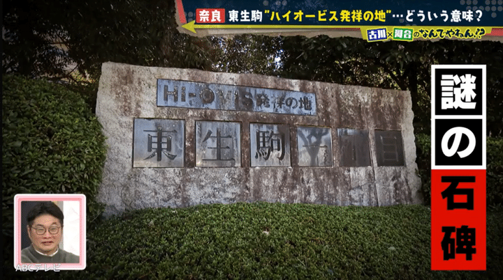 近鉄東生駒駅のすぐ近くにある謎の石碑は、「Hi-OVIS発祥の地」「東生駒一丁目」と刻まれているだけで、その詳細はまったく不明だ。東生駒一丁目は、石碑の裏手にある高級住宅街で、生駒市によって景観が管理されている。そのため河合と古川アナは、「ハイオービスは高級住宅街のこと。石碑は街の案内板の役割」と推測した。