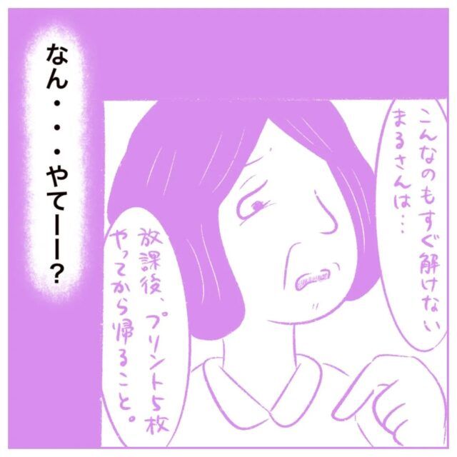 手を挙げていないのに当てられ問題が解けなかったまるさんは、先生から「こんなのもすぐ解けないまるさんは、放課後プリント5枚やってから帰ること」と言われました。