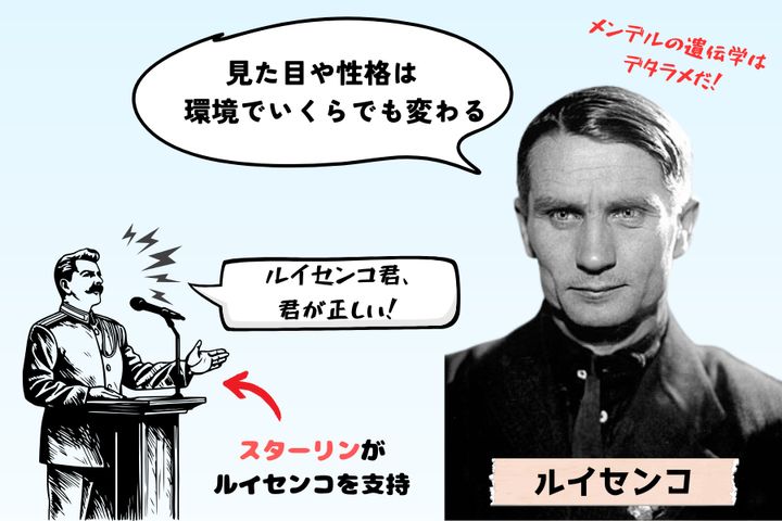 そこでソ連の著名な生物学者だったトロフィム・ルイセンコ(1898〜1976)「見た目や性格は遺伝子ではなく、育った環境でいくらでも変わる」と、メンデルの遺伝学に真っ向から反対する学説を唱えます。