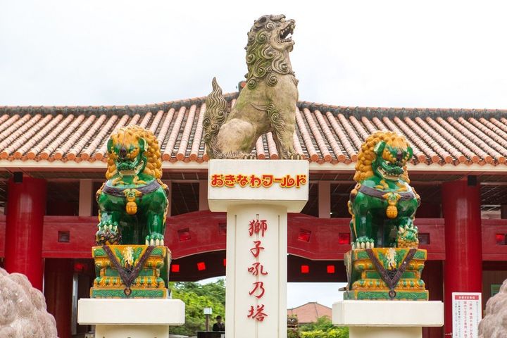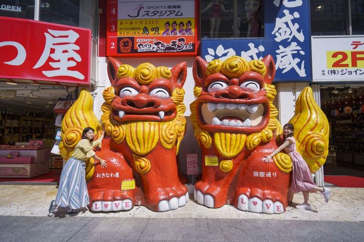 赤い看板が目印の「おきなわ屋 本店(おきなわや ほんてん)」。店頭では巨大な赤いシーサーとユニークなオブジェがお出迎え。オーナーの趣味で集められた貴重なおもちゃや骨董品が飾られた独特の空間には、昔なつかしい沖縄の駄菓子や食品をはじめ、ご当地キャラクターグッズやオリジナルの商品などが所狭しと並んでいます。