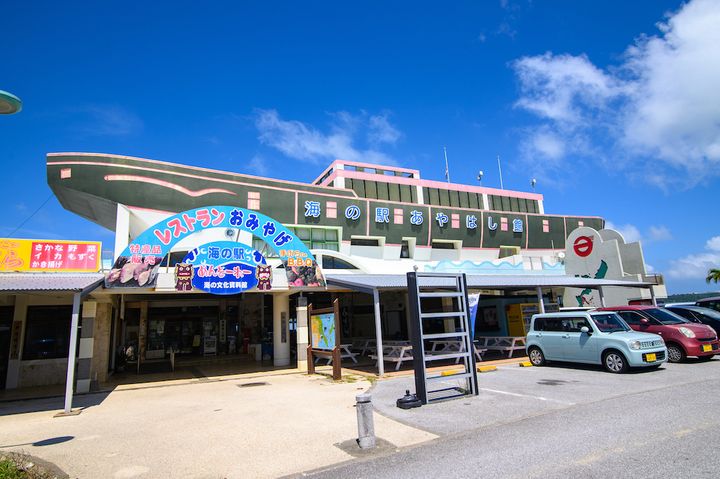沖縄本島中部のうるま市から4つの離島へと延びている海の道が「海中道路(かいちゅうどうろ)」。その海中道路の中間地点、平安座海中大橋を渡ってすぐの場所にあるパーキング施設が「海の駅あやはし館(うみのえきあやはしかん)」です。船をモチーフにした特徴的な建物で1階に物産店やレストラン、2階に入場無料の海の文化資料館があります。
