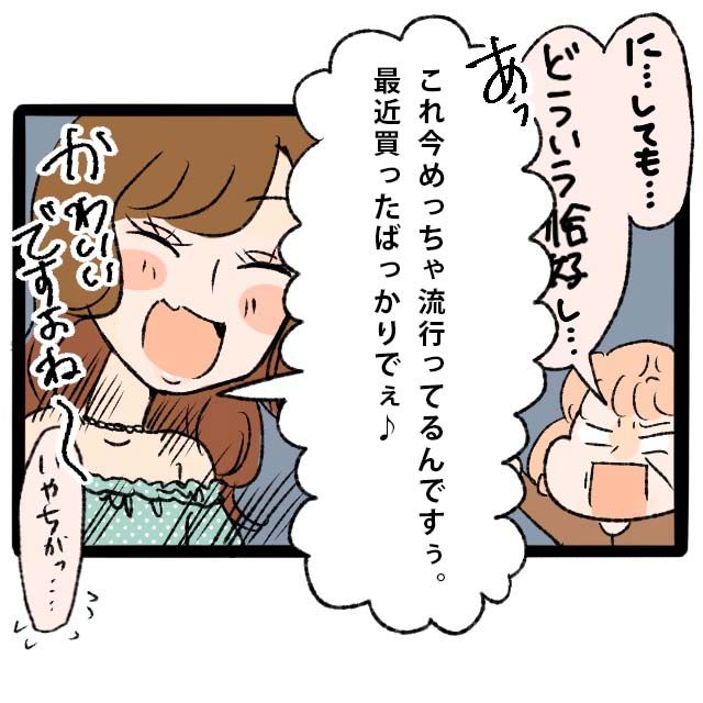 挨拶した後で「に・・しても・・どういう恰好し・・」と義母がいいかけると、それを遮るように「あっ、これ今めっちゃ流行ってるんですぅ。最近かったばっかりでぇ」「かわいいですよね~」と義母に有無を言わせず畳み掛けるみなみちゃん、そんなみなみちゃんに圧されてたじたじの義母でした。