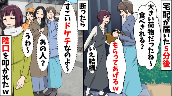 3. 「取り寄せ多すぎ!ちょーだい♪」宅配到着後、隣人がクレクレ攻撃。断ると近所に酷い噂…?私の反撃開始!
