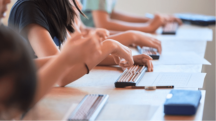 鉛筆を握って、やや前かがみでそろばんをはじく皆の姿勢、漂う緊張感と伝わる集中力。