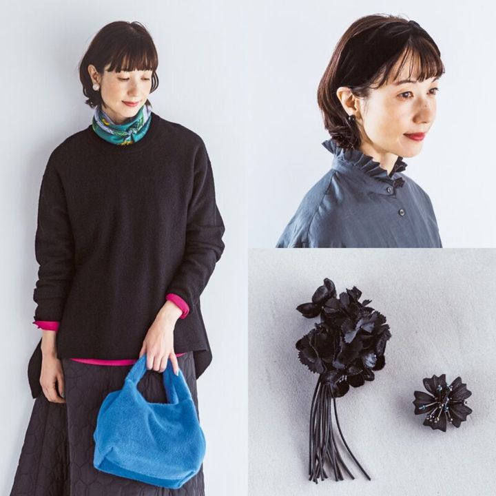 黒のコサージュは取り入れやすく、女性らしさと華やぎがアップ。同色の黒アウターにも馴染み、普段カジュアルの格上げに。