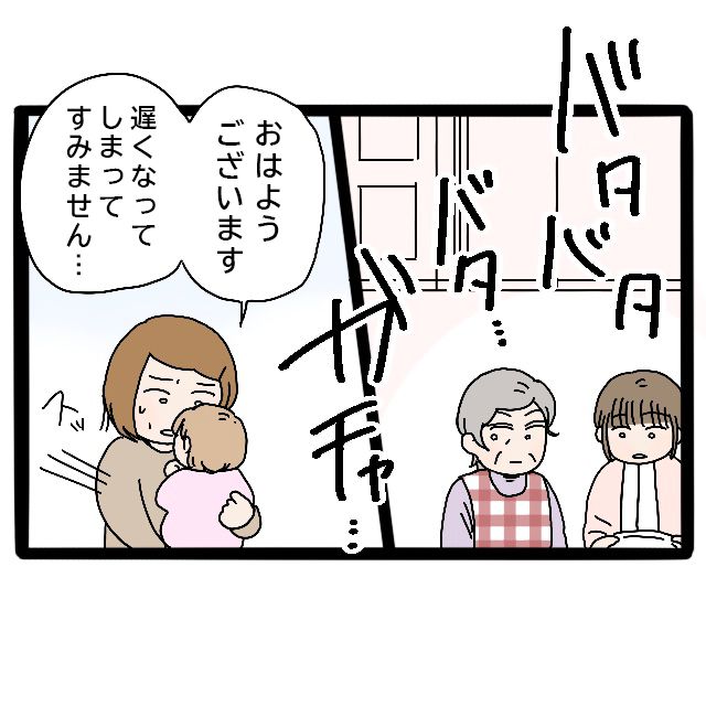 どたばたと音がして、娘つむちゃんを抱えたみずほさんが慌ててキッチンへ入ってきました。「おはようございます、遅くなってしまってすみません」泣きそうな顔で入ってきたみずほさんです。