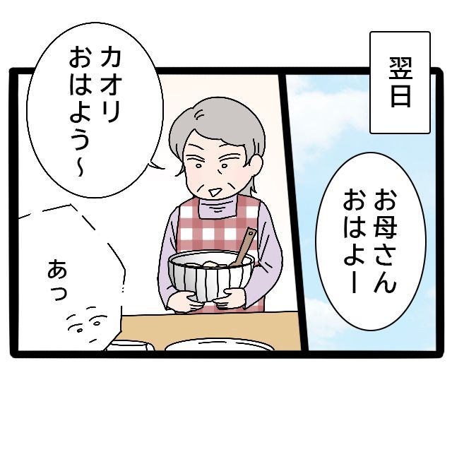 翌朝、カオリさんがキッチンへ行くと、既にお母さんが朝食の準備をしていました。「あ、カオリおはよう。」と、にこやかです。