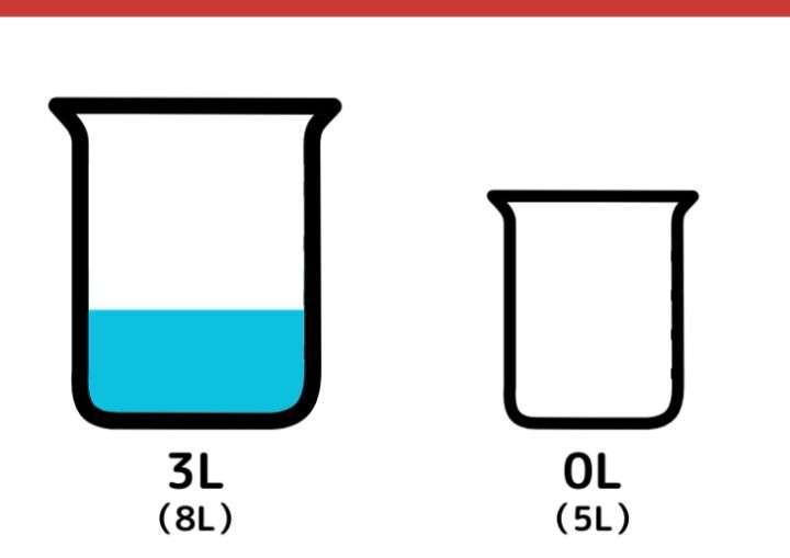 この時点でそれぞれの容器は、次の通りになります。8Lの容器→3L、5Lの容器→5L。