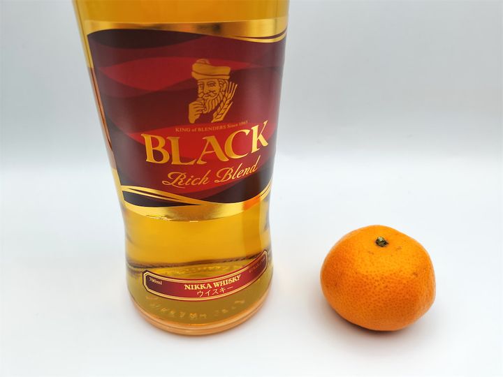 ロックグラスに入った琥珀のウイスキーの中にオレンジ色の冷凍みかんが入っている様子は、ちょっとおかしくもありますが不思議ときれいでおいしそうにも見えます。グラスを鼻に近づけるとしっかりとブラックニッカリッチブレンドのいかにもウイスキーらしい香りがして、そのまま口へ運ぶとふわっと芳醇な味と香りが舌の上から鼻に抜けていきました。そして溶け始めている冷凍みかんをマドラーでちょっとだけ潰してみると、苦みの中に少しだけ甘みが感じられます。オンザロックの氷の代わりに冷凍みかんを使うとは、ニッカウヰスキー公式さんもなかなか洒落たことをしますよね。こうした楽しみ方は大歓迎です。