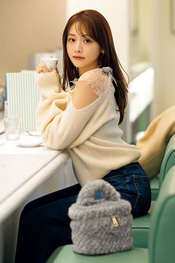 レースオフショルニット¥25,960/FRAY I.D コート¥58,300/ジャスグリッティー デニムパンツ¥11,000/Mila Owen バッグ¥12,100/アルテミス by ダイアナ(アルテミス by ダイアナ アーバンドック ららぽーと豊洲店) イヤリング¥5,500/Jewel tree、リング[左手]¥19,800/masae(ともにロードス)