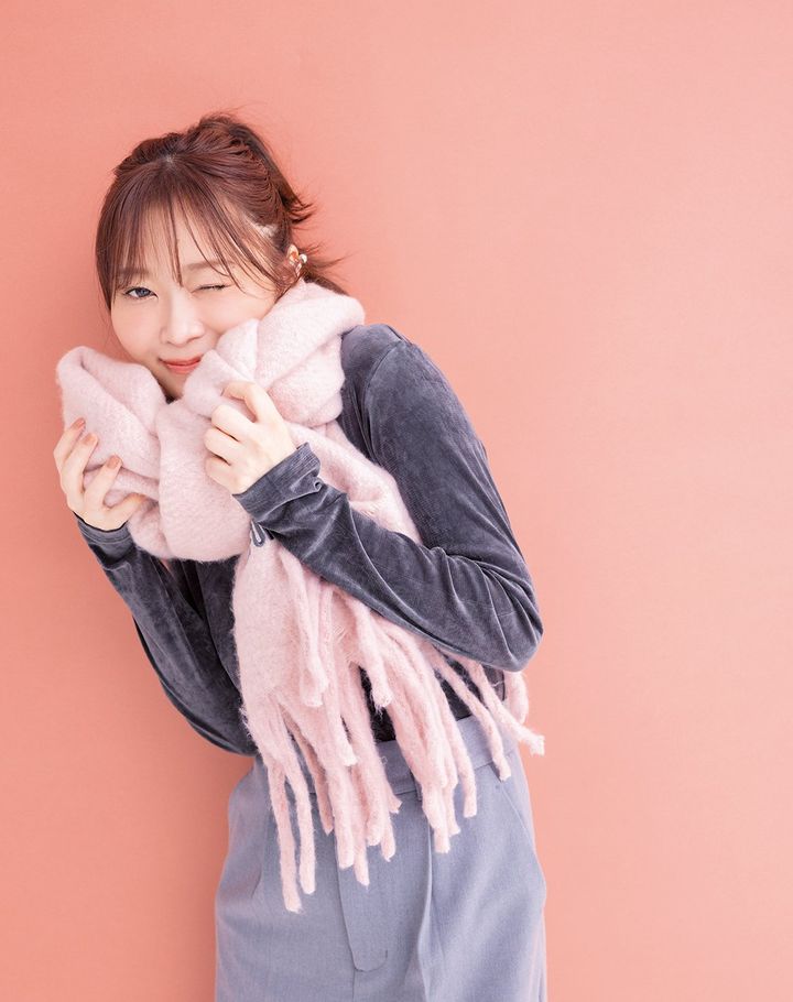 「パステルピンクのマフラーでするおっきなリボン結びは、arっ子、全員好きでしょ? 最初、大人には可愛すぎるかなってドキドキしたけど、グレーのトップスと合わせて甘さを引き算したら大成功。日常にさらっと取り入れたい」