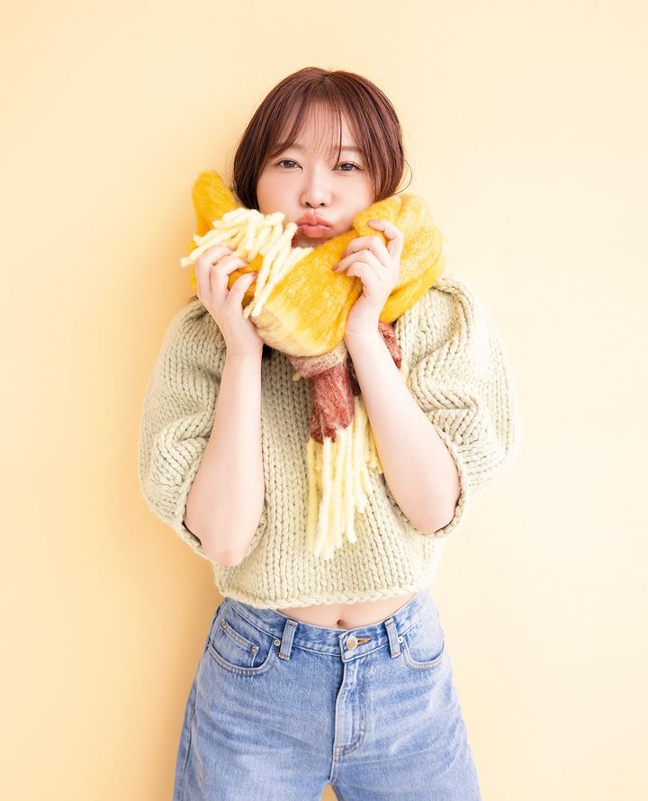 「ボリューミィな大判マフラーをシンプルに巻くだけで憧れの〝くしゅっと感〞が出せることを今日初めて知りました。余談ですが、イエローはアイドル時代、私のサイリウムカラーだったので、クローゼットの中に増えがち。今日のこのマフラー、デイリーにヘビロテしたいですね」