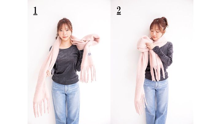 1.真ん中を首の前に当て、両端をぐるんと前へ。