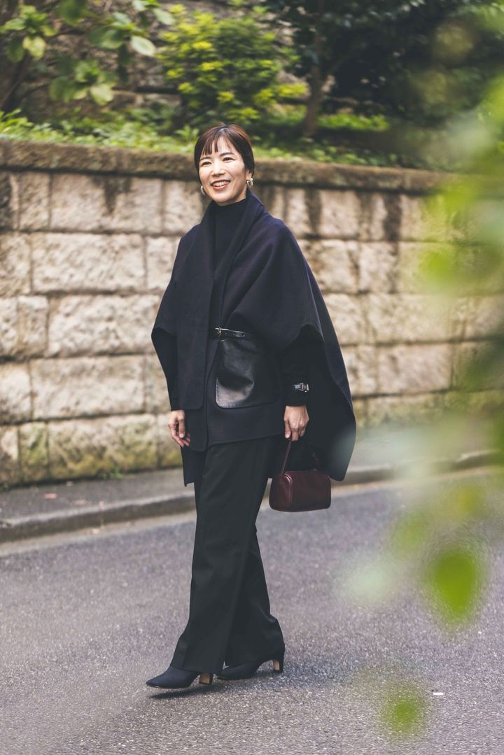 「今まで持っていなかった落ち感のあるポンチョコート。動くと裾が揺れて立ち振る舞いが優雅に見える気がして気に入っています。着るだけでオシャレに見えるので、ママ同士で集まる特別な席によく羽織っていきます。今回は黒でシックにまとめましたが、差し色のシューズやバッグを投入したコーディネートにも挑戦してみたいです」梅本弓夏さん・37歳(164cm/4歳と1歳の男の子ママ)