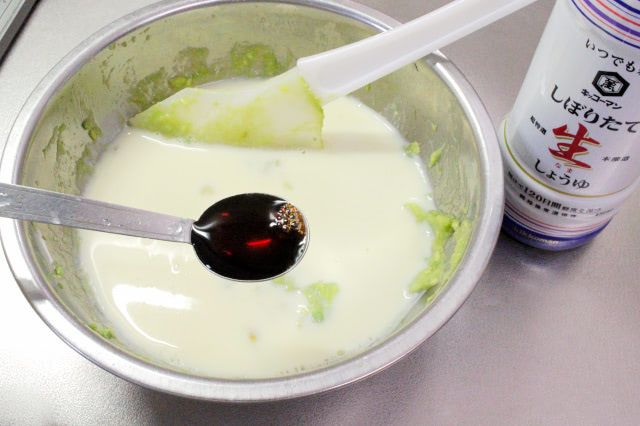 2. 豆乳、蜂蜜、しょうゆを加えてよく混ぜます。