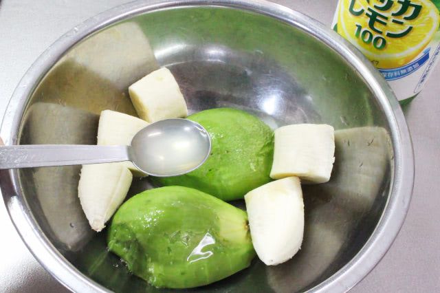 1. ボウルに皮を剥いて種を取ったアボカドと皮を剥いてカットしたバナナを入れ、レモン汁をかけてスプーンなどで潰します。