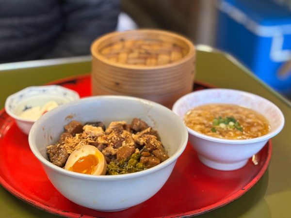 五香粉の独特な香りがしっかり立った本格的な魯肉飯です。点心は、蒸篭に入っていて熱々。まろやかな卵スープは、スパイシーな魯肉飯との相性抜群でした。滑らかな杏仁豆腐がついてくるのも嬉しいポイントですね。