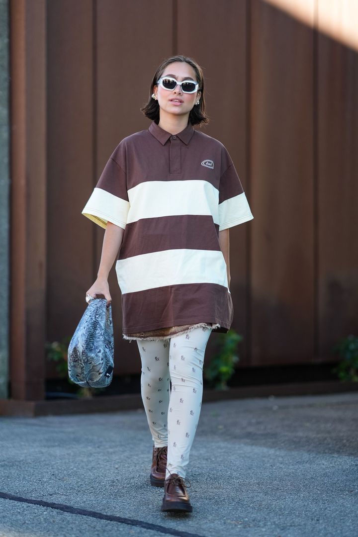 ポロシャツ×ブラウンのレザーシューズのプレッピー調ルックは、柄タイツやサングラスを加え、ストリートライクに印象をチェンジ。さらに、ビッグサイズのポロシャツからデニム素材のミニスカートをレイヤードしチラ見せすれば、一気に上級者の着こなしに。