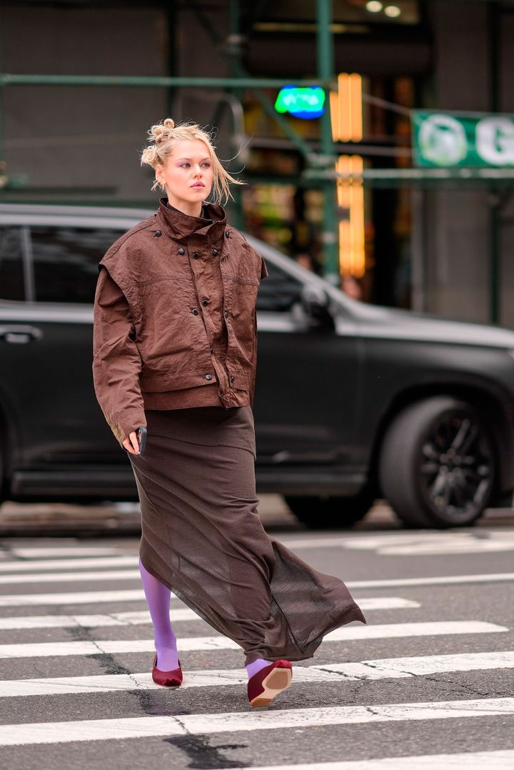 シアー素材のミディ丈スカートは、シーズンを問わず穿ける優れもの。今の時期ならば、引き続き脚光を浴びているアースカラーのヘビーアウターを羽織り、軽やかな素材とのコントラストを楽しみたい。上下ワントーンに、アクセントとしてカラフルなタイツとバレエシューズをチョイスし、冬のスタイルをプレイフルに彩って。