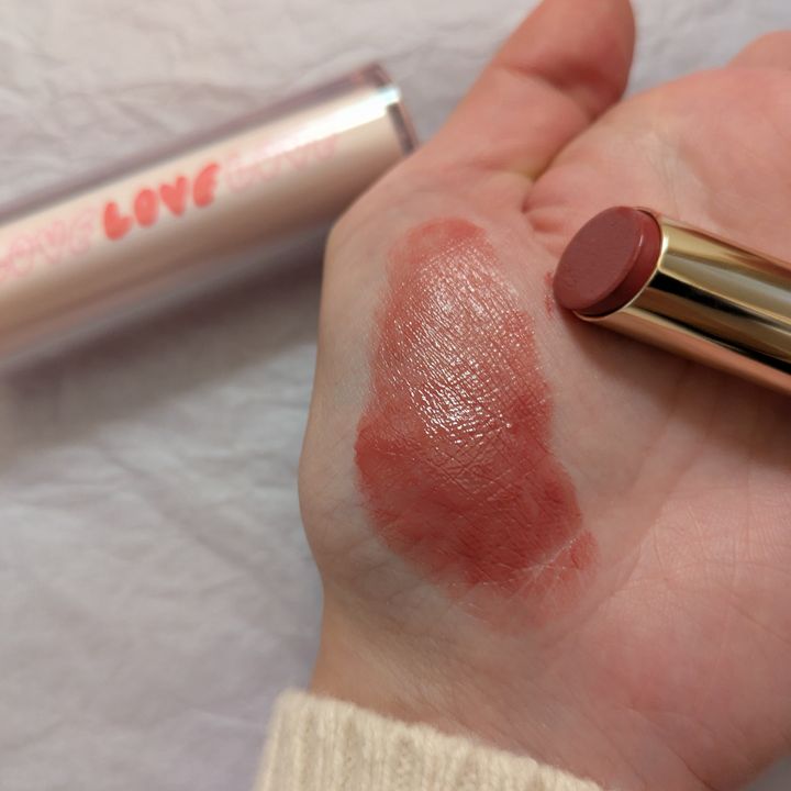 パレット左側にある上下のピンクカラーは青みピンクっぽい透け感あって使いやすい!
