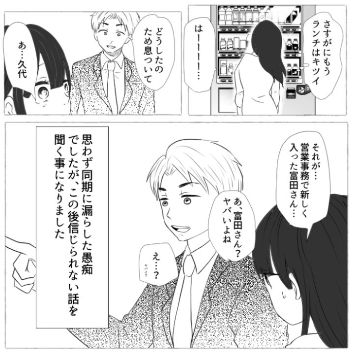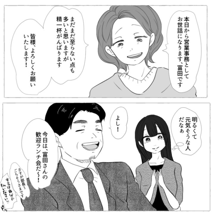 主人公の会社に営業事務としてやってきた1人の女性。明るくて元気そうな人なので、これから一緒に働くのが楽しみだと思っていたのに・・・。