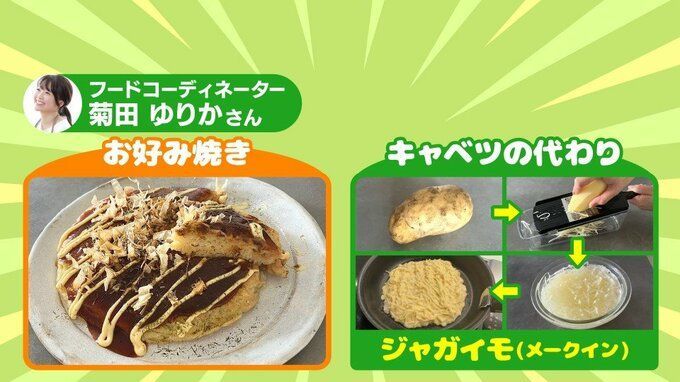 メークインをスライサーでカットしてお好み焼きにいれると食べ応えもアップして、シャキシャキ感も楽しめます。