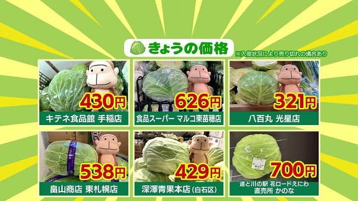 札幌市内のスーパーや小売店、道の駅など6つの店で1月17日時点の時点の値段(直径約15センチ・1玉)を調べてみると…