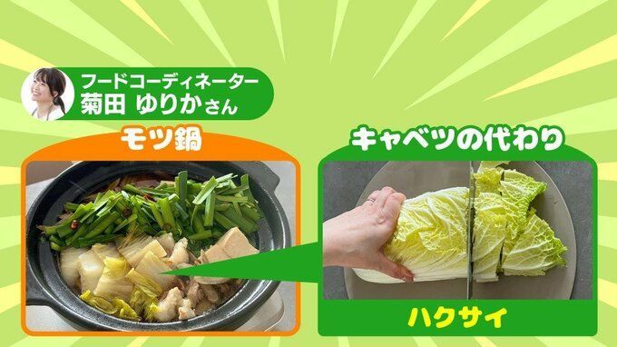 モツ鍋には白菜を使うと、食材のうまみを吸うのでおいしくなります。レタスでもOK。