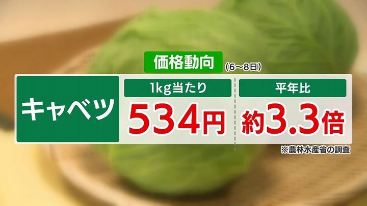 農林水産省の最新の価格調査によりますと、キャベツ1キロ当たりの値段は平年の3倍以上になっています。