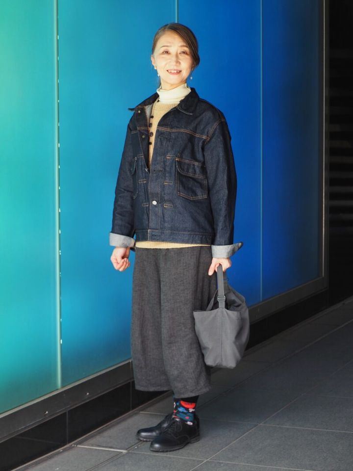 「ユニクロ」のハイネックと、アメリカのデイリーウェアブランド「ジャンセン」のニットをレイヤード。顔映りを意識して、明るいカラーを選ぶのがれいこさんのこだわり。その上からGジャンをシャツのように重ねることで、鮮度の高いスタイリングが完成!