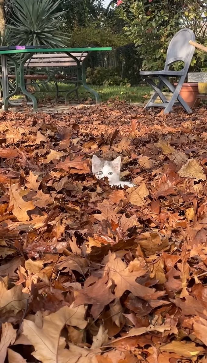 落ち葉の海からひょっこり顔を覗かせる子猫。 小さなおててで落ち葉をカキカキして前に進んだり、思いきりダイブしたりと、無邪気に遊ぶ姿がとってもかわいくて癒されます!