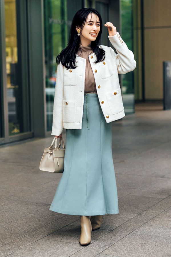 派手色や色数の多用は、ONだと品に欠けがち。色数を絞りつつ、落ち着きある色みでまとめるのが着映えの秘訣です。白ジャケットとのクリーンな配色で、寒色のすがすがしさをさらに高めて。