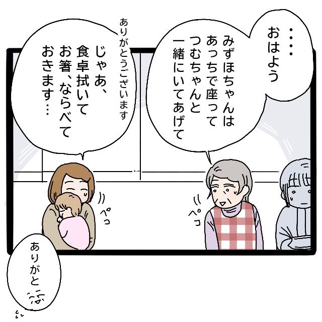 お母さんは「おはよう。みずほちゃんはあっちで座ってつむちゃんと一緒にいてあげて。」と笑顔で答えました。みずほさんは「ありがとうございます。食卓拭いて、お箸並べておきます」とペコリと頭を下げました。
