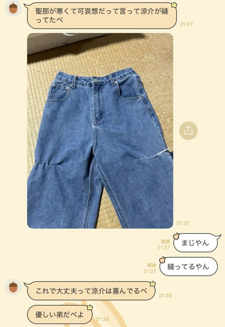 サイドにダメージ入ってるジーンズ、家帰ったら弟(自閉症)にガチでズボン縫われててココ最近で1番笑った 優しすぎるけどおもろすぎる X「せいなさん」(https://x.com/new_seina3/status/1871524704718299268,2025年1月13日最終閲覧)