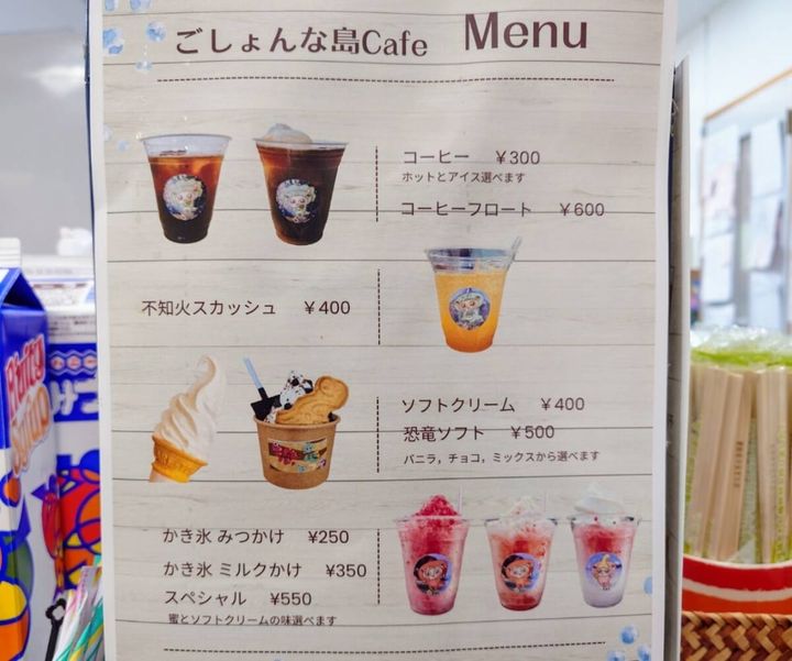 しおさい館では、船を待つ間にもピッタリなカフェメニューも用意。コーヒー、不知火スカッシュ、ソフトクリームなど、休憩にぴったりなラインナップがあります。