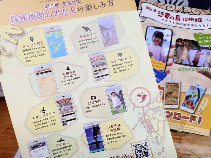 来島前に、島内の情報を確認できる「恐竜の島 探検地図 しまたん」をダウンロードしておくと便利。恐竜との写真スポットやスタンプラリーで島を巡る遊びだけでなく、クーポン、天草全体の情報、交通方法についてなどもチェックできます。