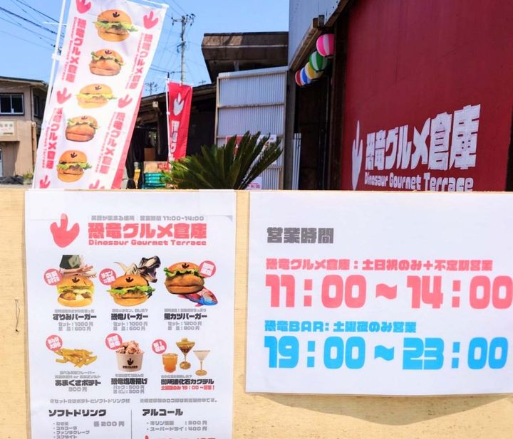 御所浦港前に2024年8月にオープンしたハンバーガーとからあげのお店「恐竜グルメ倉庫」では、鶏のから揚げを恐竜にみたてた「恐竜バーガー」や、御所浦産の鯛やすりみを使ったバーガーが大人気。
