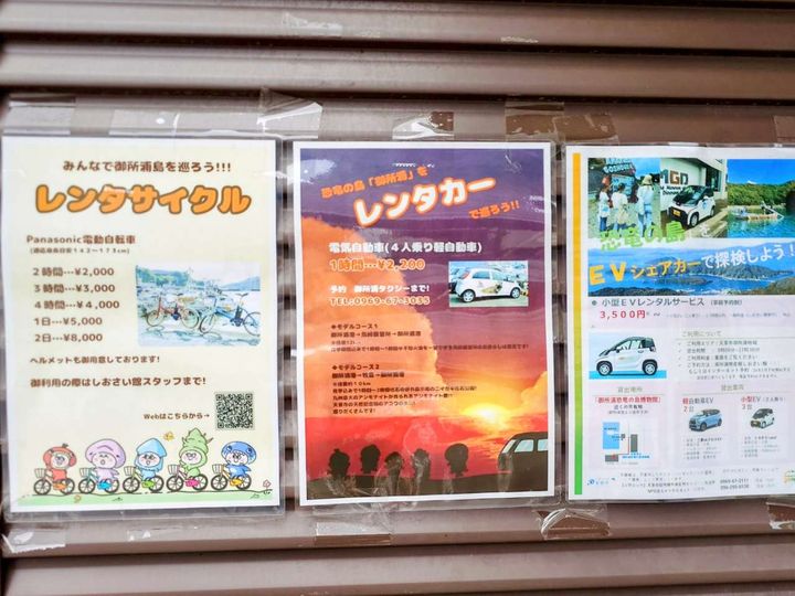 島巡りには「レンタサイクル」や「レンタカー」を利用すると島内のスポットを効率的に巡れるのでおすすめ。先に紹介した御所浦観光物産館しおさい館にて貸出対応しています。